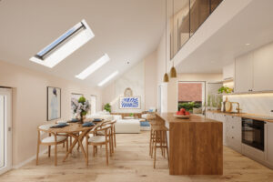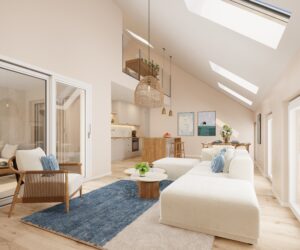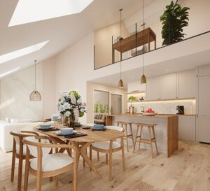 Au dernier étage, un appartement en duplex vient couronner l’ensemble. Niché sous la toiture, il propose une atmosphère singulière, où les volumes et la lumière composent un cadre de vie à la fois spacieux, chaleureux et intime.